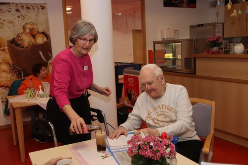 Samer Alhalabi, Mitarbeiter der Sozialen Betreuung, sitzt mit eine Gruppe Bewohnern an einem großen Tisch und spielt Gesellschaftsspiele mit ihnen. Bewohnerin Gerdi Bentz schaut kurz vorbei, bleibt auf ein Stück Kuchen und kommt ins Gespräch mit Ursula Müller, die ehrenamtlich in der Cafeteria arbeitet, heute aber einfach so vorbeigekommen ist. Auch Erika Schmitt macht einen kurzen Zwischenstopp, bevor sie ehrenamtlich Bewohner besucht.