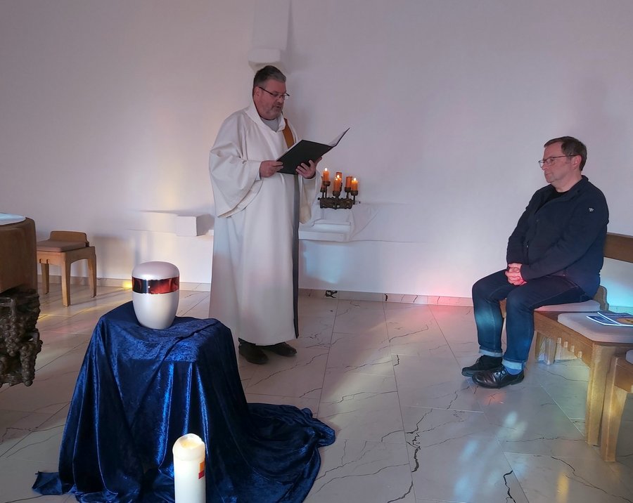 Speyer. „Ein bisschen Aufregung ist schon da. Aber ich habe mir alles aufgeschrieben und bin gut vorbereitet“, sagt Andreas Massion und deutet auf ein schwarzes Ringbuch. „Ich weiß, dass ich es kann. Die Anspannung ist aber wie in jeder Prüfung.“ Massion steht am Nachmittag des 21. November kurz vor seiner „Mustertrauerfeier“. Um 15.30 Uhr ist es soweit – in der Nardinikapelle des Speyerer Priester- und Pastoralseminars St. German beginnt der Gottesdienst mit der „Beisetzung“ der Urne von Hildegard B. Unwissende, die einfach so in die Kapelle kommen, würden nicht merken, dass es sich um eine Art „Trockenübung“ handelt: Die Urne enthält keine Asche. Und die dunkel gekleideten „Trauergäste“ sind Kursgenossen von Andreas Massion, die ihrem Kollegen bei seiner Abschlussübung beistehen. Alle von ihnen mussten diese Übung absolvieren.